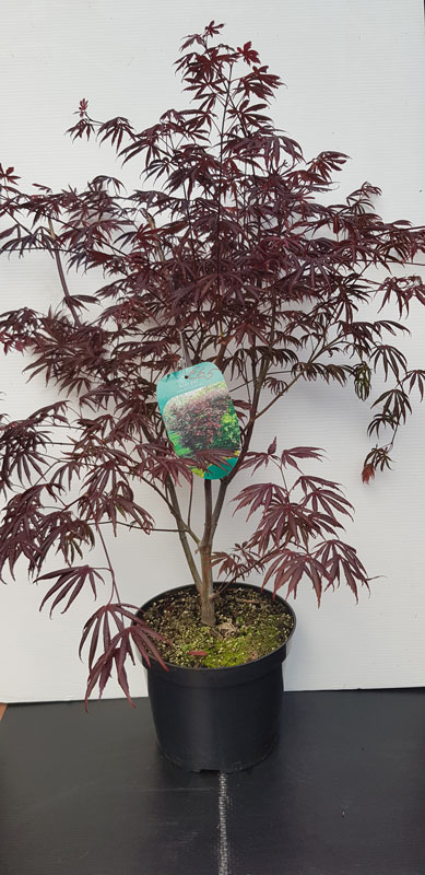 A deciduous shrub or small tree, the leaves narrowly 7-lobed with recurved margins, deep red-purple in spring, becoming greener in summer, and orange-red in autumn.