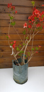 An upright, bushy, deciduous shrub with mid-green leaves and funnel-shaped reddish-orange flowers with orange-yellow veins in mid-spring.
