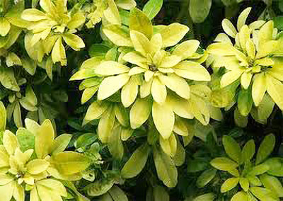 A medium evergreen shrub with bright gold & green foliage; clusters of fragrant white flowers in late spring.