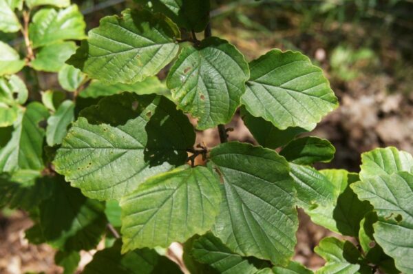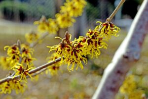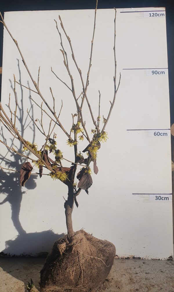 A spreading deciduous shrub or small tree, with broadly ovate or rounded leaves and fragrant golden-yellow flowers borne in small clusters on the leafless twigs from mid to late winter