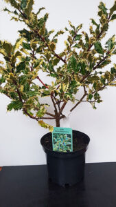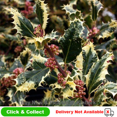 A large dense holly with spiny green glossy leaves & a creamy white margin. Also known as the silver hedgehog holly the leaves are prickly on the surface aswell as the edge