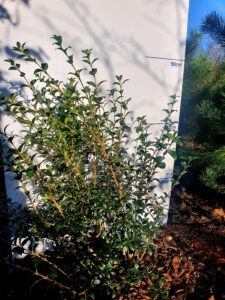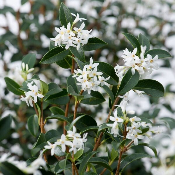 A slow growing evergreen shrub with dark green leathery ovate shaped leaves. Clusters of small white scented flowers, followed by blue-black fruits in late summer or autumn.