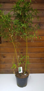 A robust bamboo, with rich yellow canes, occasionally striped with green, and narrowly lance-shaped leaves to 20cm long.