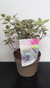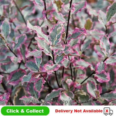 A large evergreen shrub with silvery green leaves, cream edges tinged pink.