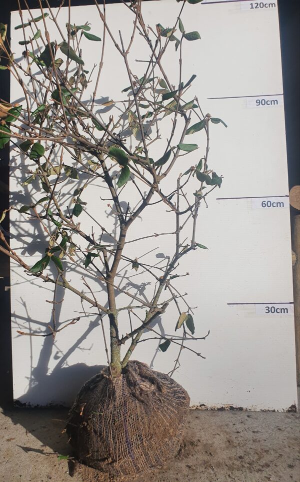 A very attractive spreading deciduous shrub of medium to large size. Round pink buds open to produce creamy white tinged pink flowers in May, that are very sweetly scented.