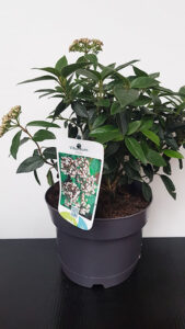A dense evergreen shrub with rinch dark green leaves, clusters of small white flowers in spring followed by a small black berry.